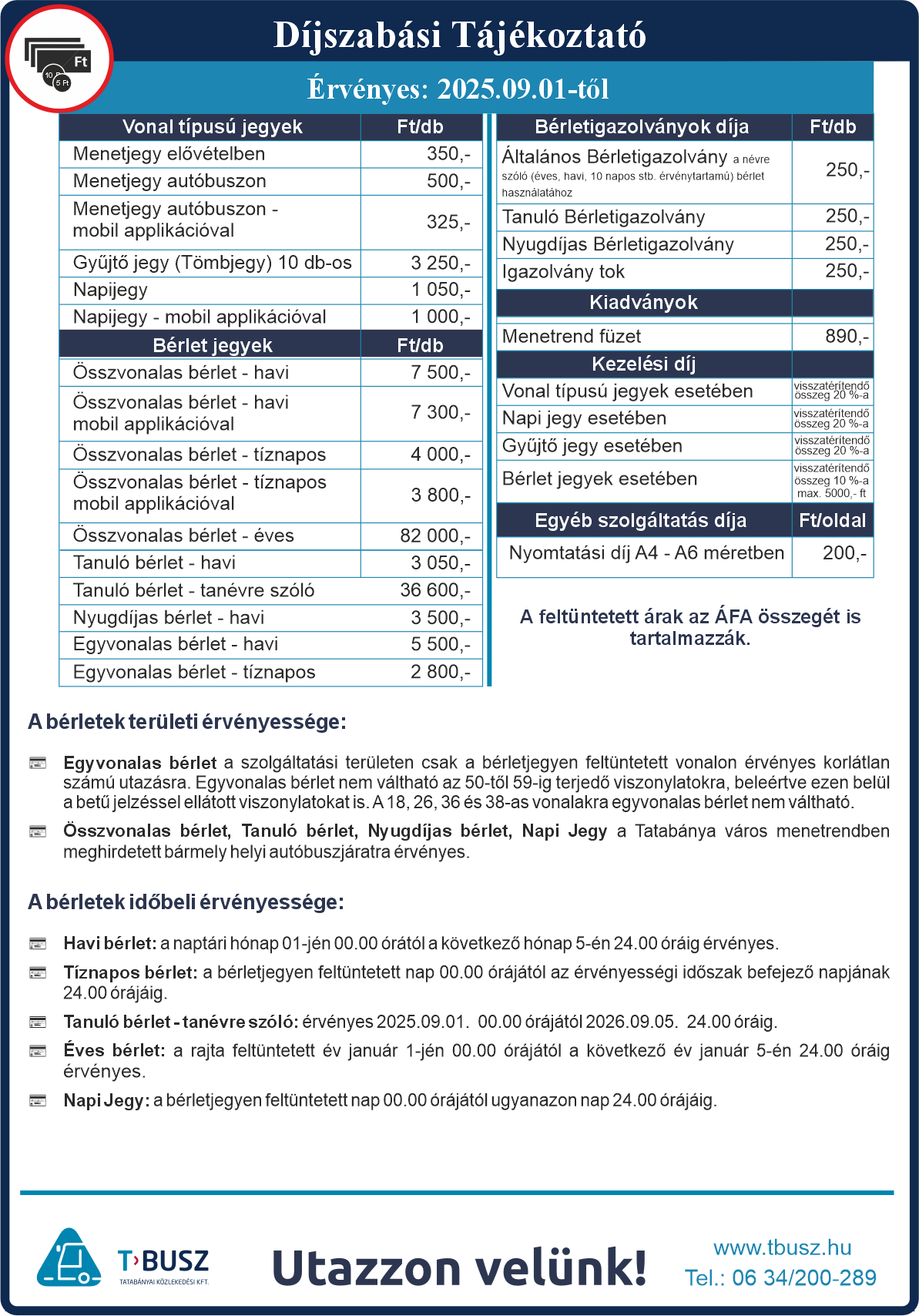 T-Busz Tatabányai Közlekedési Kft. DÍJSZABÁSA - Érvényes: 2025.09.01-től