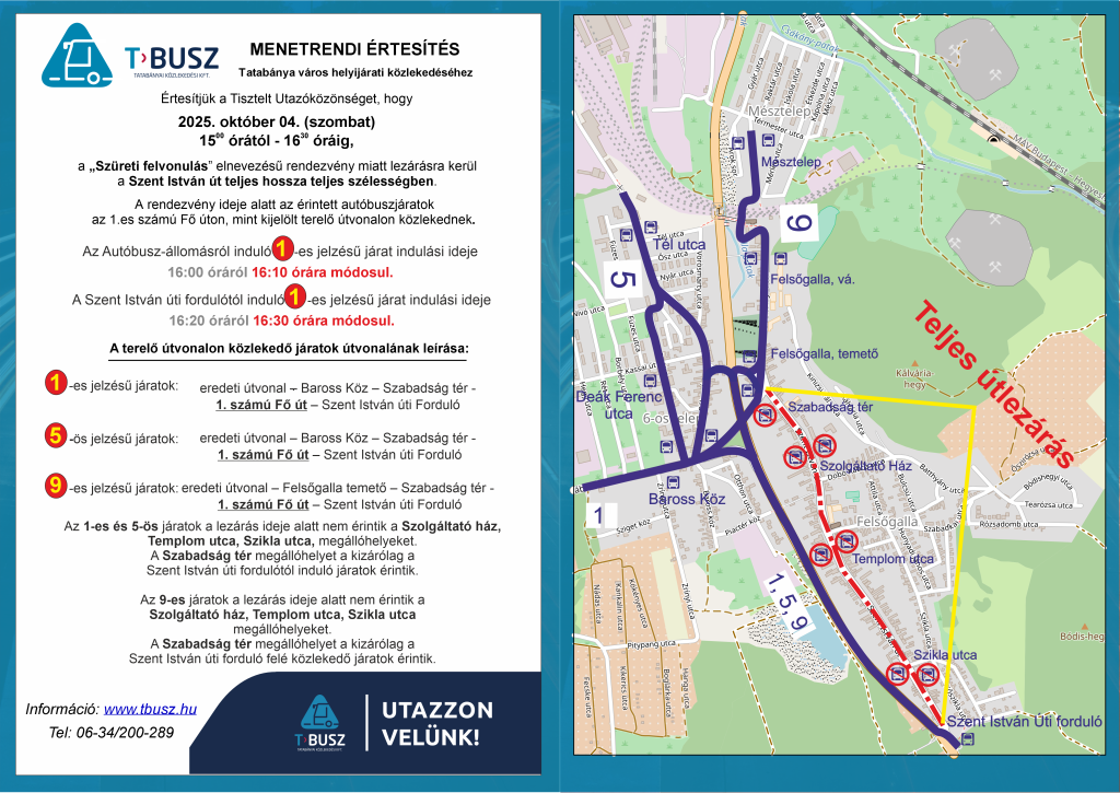 Értesítjük kedves utasainkat, hogy 2025. július 21-én 08.00 órától visszavonásig építési munkálatok miatt a Mártírok útja elnevezésű megállóhely a Fő tér irányába lezárásra kerül!
